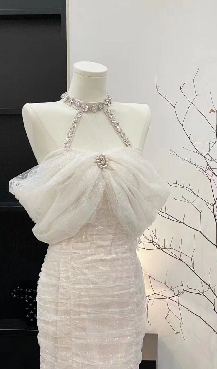 Expertly crafted with fairy white pleats, this mini party gown is the perfect choice for your next homecoming event. The delicate pleats add a touch of elegance and the mini length gives it a playful and youthful look. Made with high-quality materials, this dress is sure to make you stand out in any crowd.