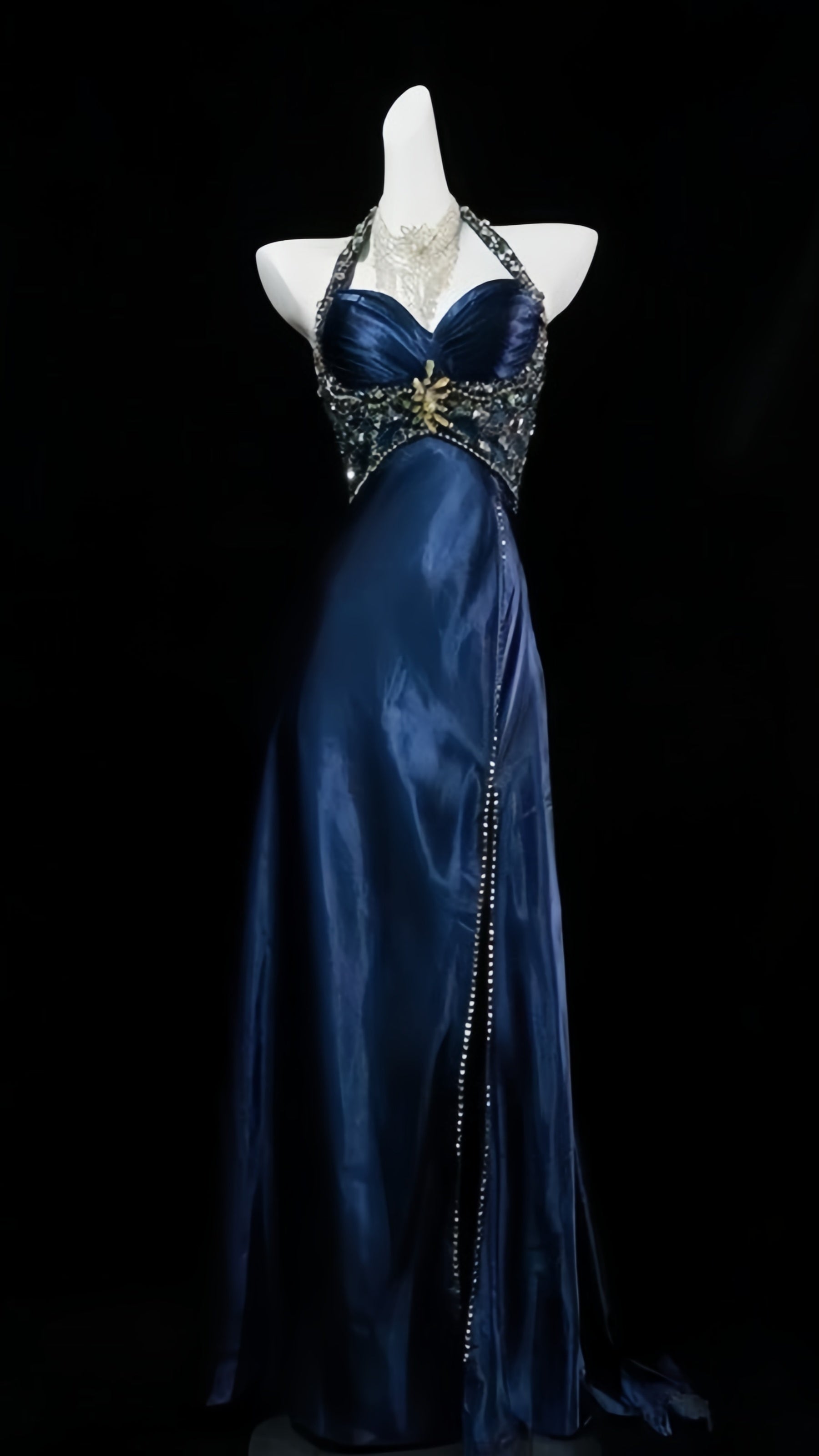 Navy Blue Halter Beaded Long Prom Dresses Slim Evening Party Gown With Slit ,LTP4041
