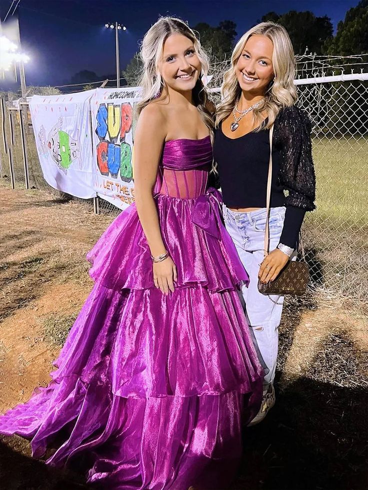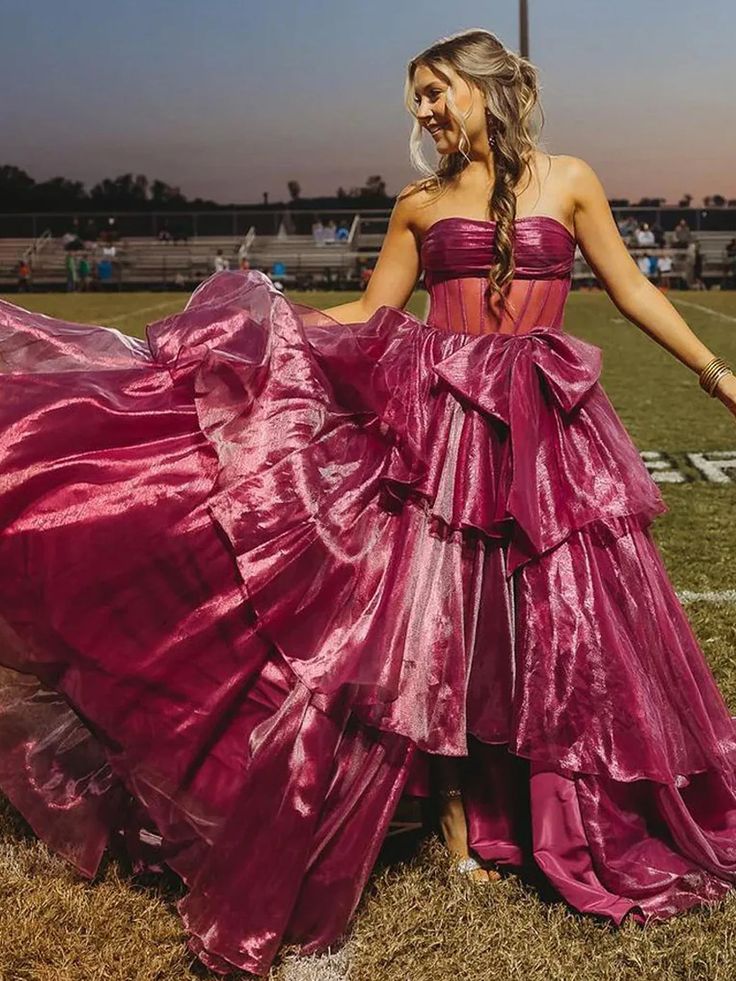 Strapless A-Line Organza Ruffle Prom Dress, Sleeveless Bowknot Evening Gown, LTP3721
