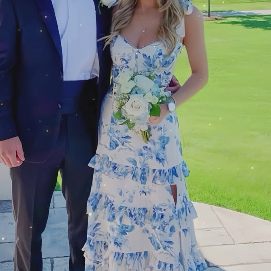 White Blue Floral A-Line Prom Dresses Long Evening Gown