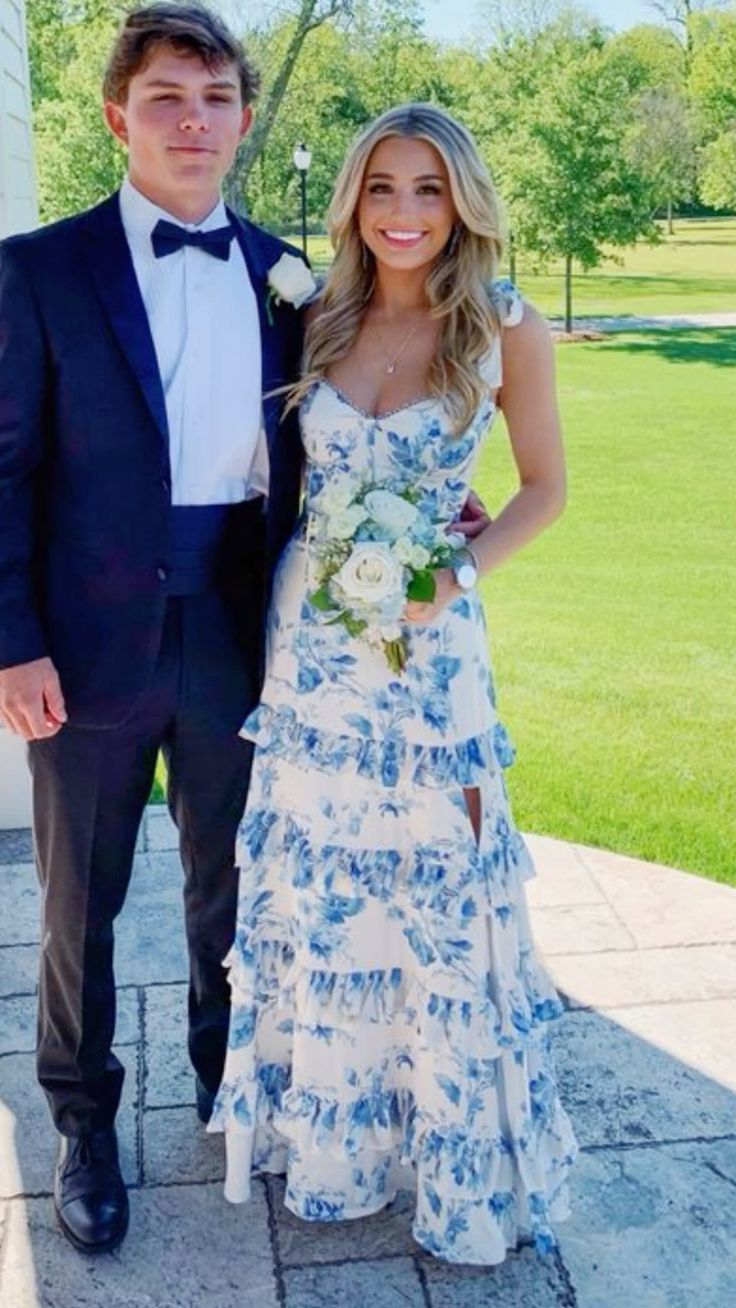 White Blue Floral A-Line Prom Dresses Long Evening Gown