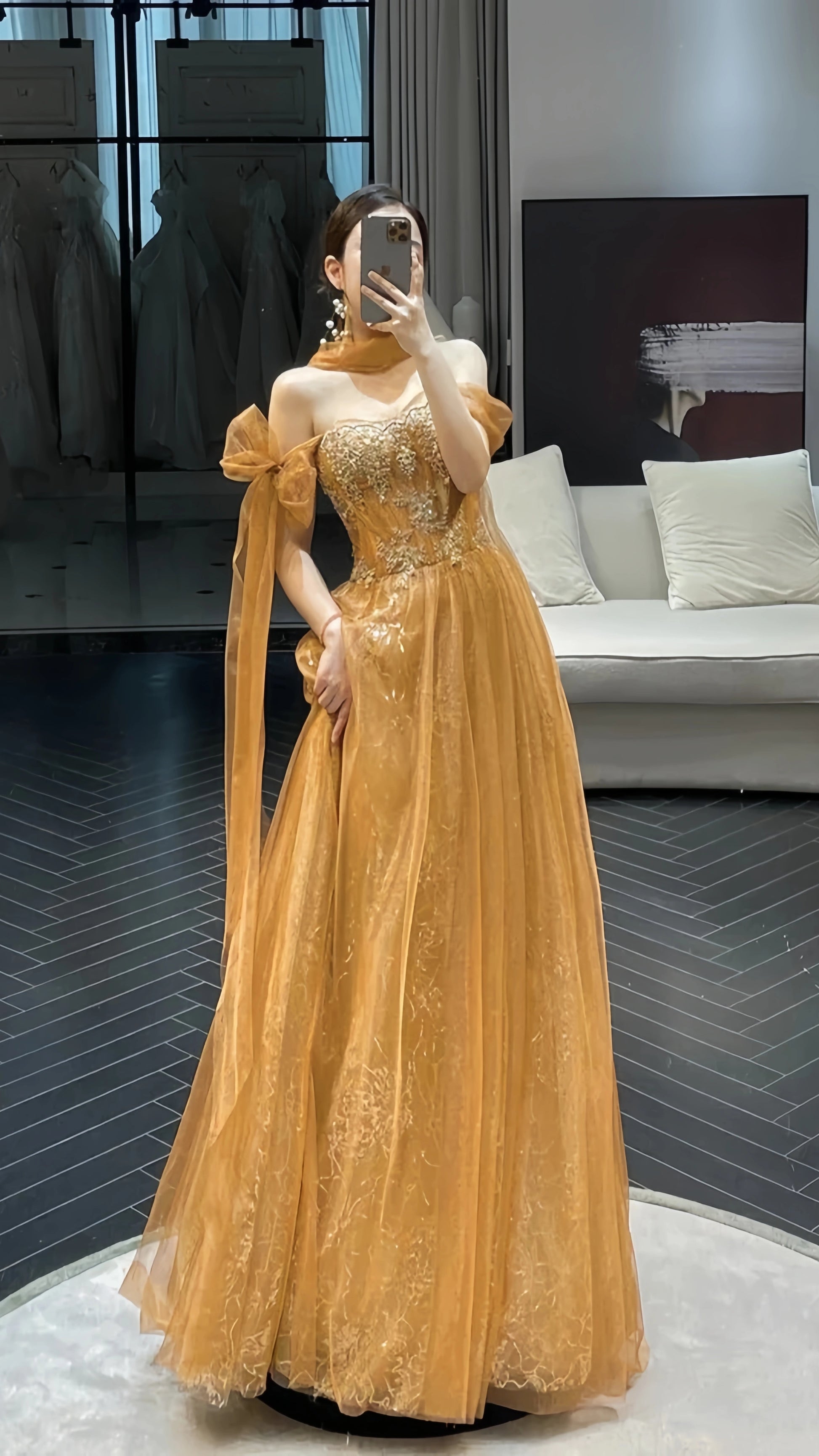 Yellow Lace Prom Dresses Full Length Beaded Evening Party Dress,LTP4085